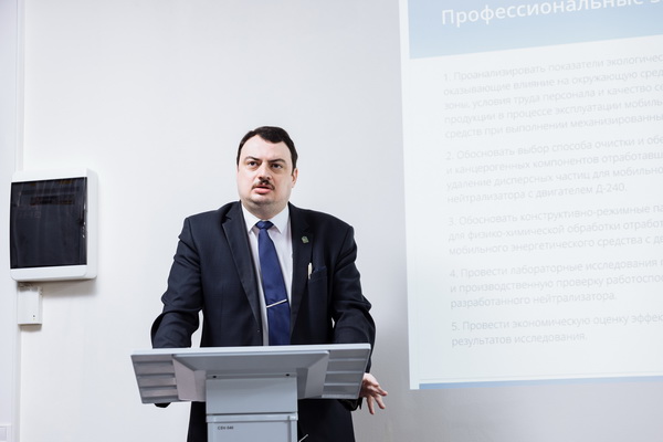 Кандидат технических наук, доцент кафедры эксплуатации машинно-тракторного парка Дмитрий Олейник выступил перед собравшимися с презентацией проекта автоматизированного устройства для влажной очистки отработавших газов дизельных двигателей внутреннего сгорания с ионизирующим контуром.