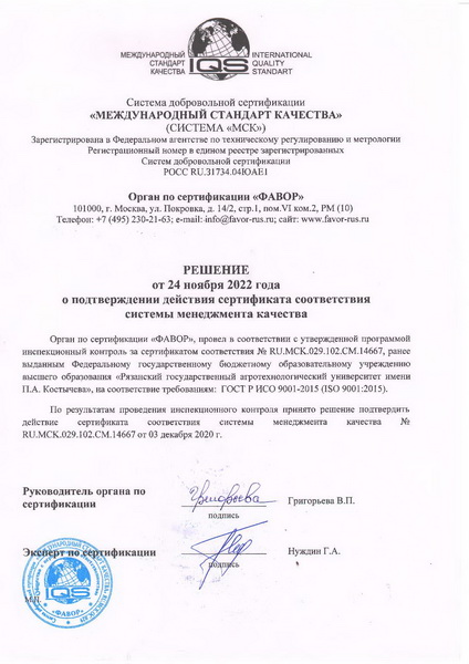 По результатам проведённого инспекционного контроля органом по сертификации систем менеджмента качества "Фавор" (Россия, г. Москва) 24 ноября 2022 года университету выдано решение о подтверждении действия сертификата соответствия системы менеджмента качества.