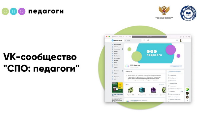 Институтом развития профессионального образования при поддержке Министерства просвещения Российской Федерации создан новый ресурс для педагогов ― сообщество "СПО: Педагоги" в социальной сети ВКонтакте.