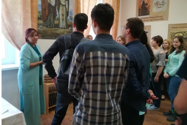 Заведующая сектором научной библиотеки Миронова Ю.А. проводит экскурсию по музею книги для студентов.