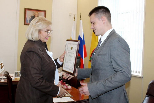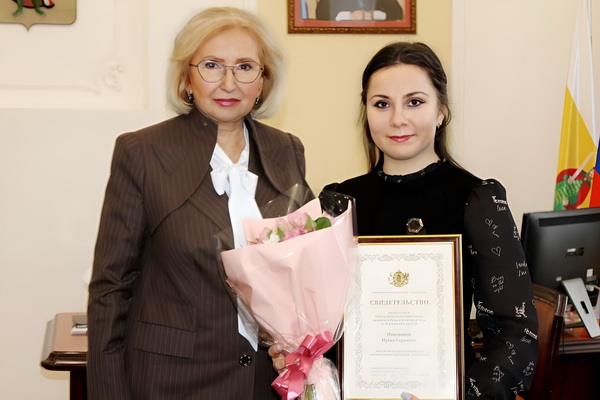 За успехи в учебе, высокие результаты в научно-исследовательской, инновационной, творческой деятельности, активное участие в общественной жизни и в целях поддержки активной и талантливой молодежи поощрительные премии присуждены Ирине Меньшовой (факультет экономики и менеджмента) и Егору Базыке (автодорожный факультет). Свидетельства вручала глава муниципального образования, председатель Рязанской городской Думы Татьяна Панфилова. "Сейчас вы делаете первые шаги в научной работе. Надеюсь, не остановитесь на достигнутом и внесете достойный вклад в развитие нашего любимого города", - выразила надежду Т.Н.Панфилова, поздравляя номинантов.