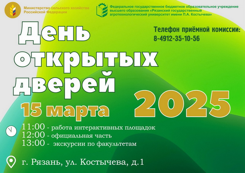 День открытых дверей пройдёт в главном корпусе Рязанского государственного агротехнологического университета имени П.А. Костычева (г. Рязань, ул. Костычева, д.1).