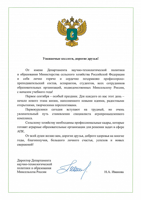 От имени Департамента научно-технологической политики и образования Министерства сельского хозяйства Российской Федерации и себя лично горячо и сердечно поздравляю профессорско- преподавательский состав, аспирантов, студентов, всех сотрудников образовательных организаций, подведомственных Минсельхозу России, с началом учебного года!