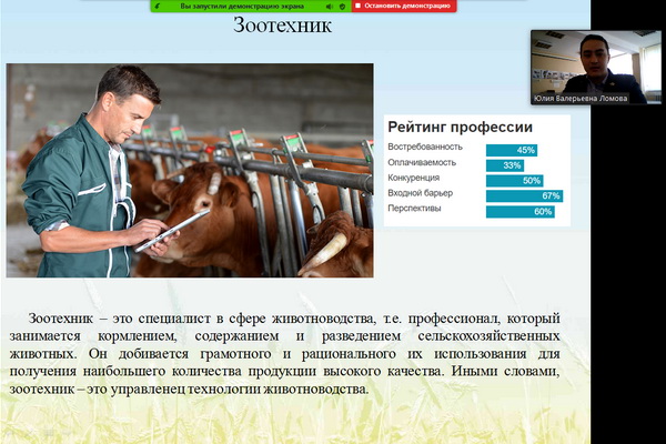 Ведущие преподаватели факультета ветеринарной медицины и биотехнологии Кулибеков К.К. и Ломова Ю.В. обсудили с молодёжью актуальные проблемы сельского хозяйства, поделились своими знаниями и опытом в области животноводства. Школьникам рассказали о роботизации и цифровизации животноводства, об инновационных технологиях и профессиях будущего в агропромышленном комплексе. Занятие сопровождалось практической частью Урок проходил очень активно, школьники не скучали и активно не только отвечали на вопросы, но и сами задавали их преподавателям.