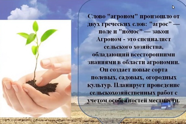 Цель занятия - расширить знания и представления учеников о профессии агронома, смотивировать их к выбору будущей профессии. Сегодня важно не только обучать ребят, но и объяснять им, в чем перспективность их будущей профессии.